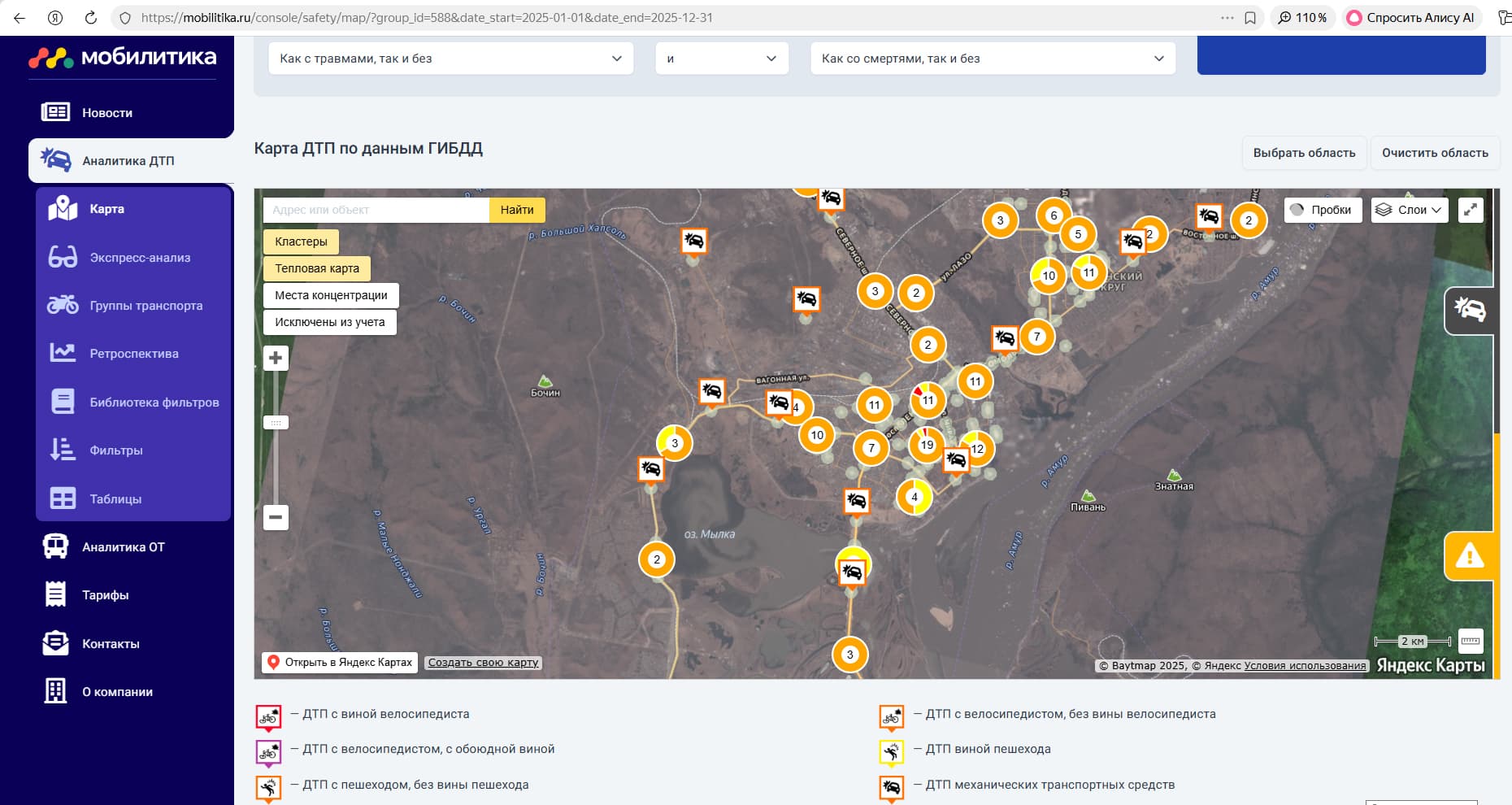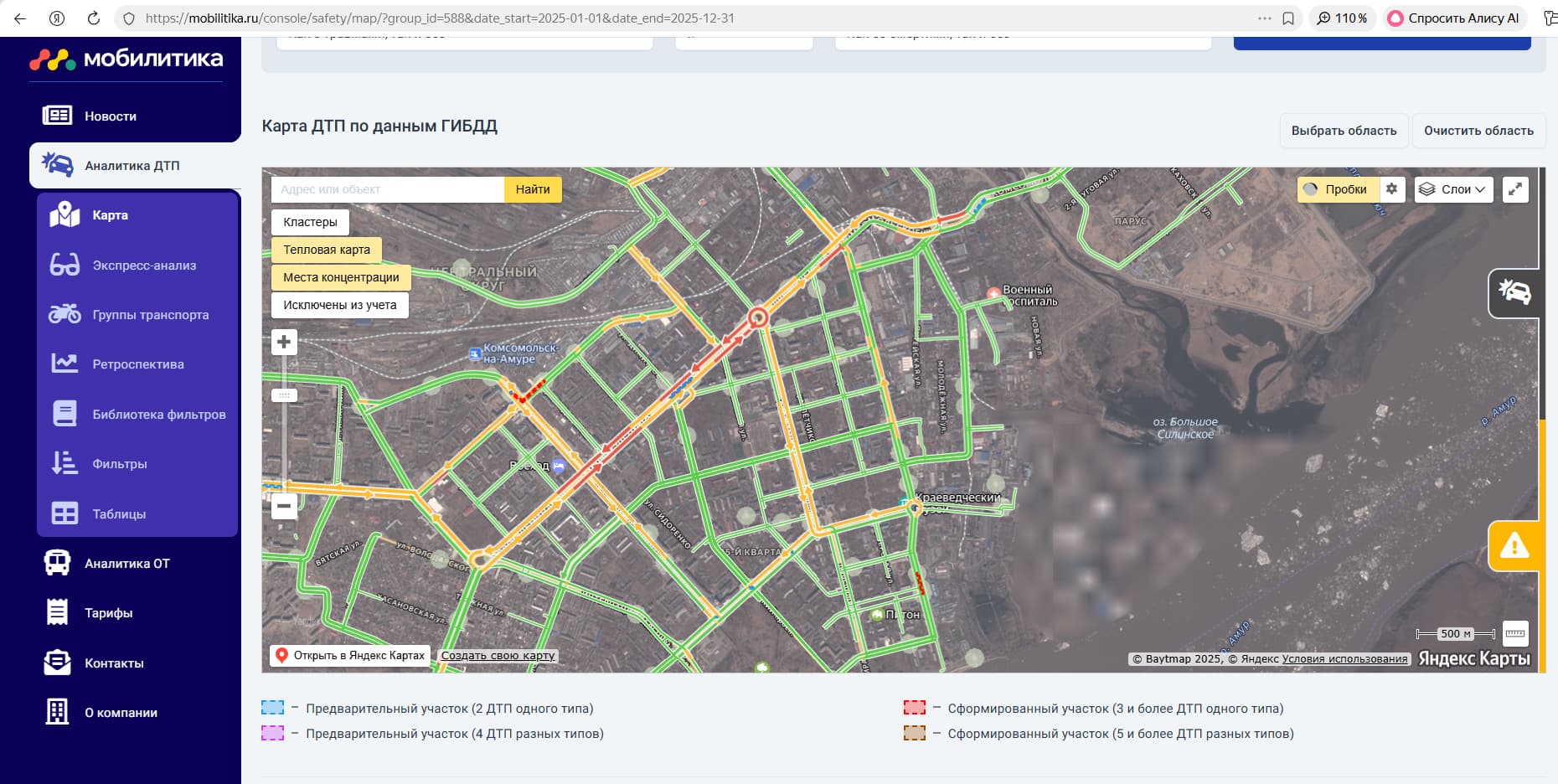 Авторы проекта создали систему, которая на карты наносит места ДТП, пробки и прочую информацию для всех городов страны. В этом сервисе Комсомольск «засиял» новыми красками.