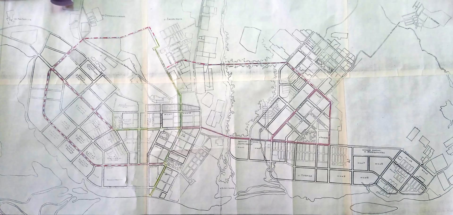 Схема развития трамвая в Комсомольске-на-Амуре. Зеленым отмечена существовавшая сеть. красным перспективная
